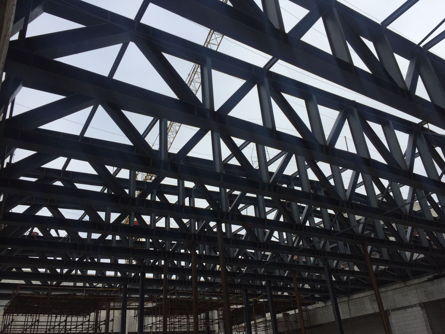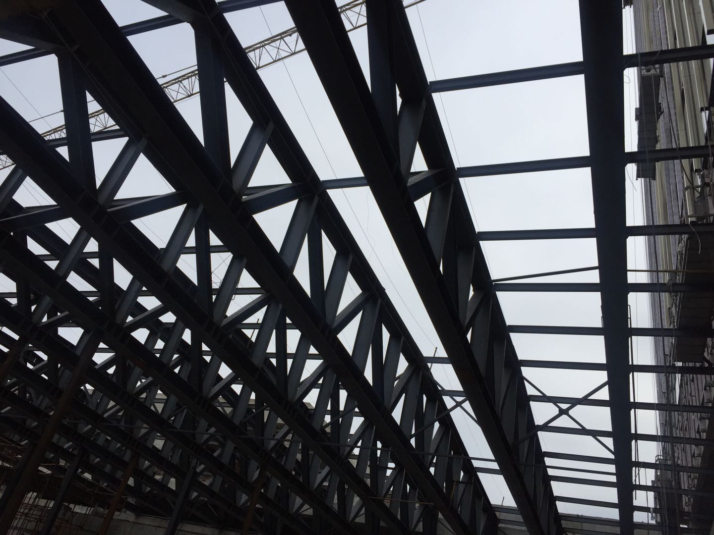 項(xiàng)目總占地面積19.98畝,其主體擬建一座五星級賓館,總建筑面積約61150平方米(其中地上40235平方米,地下20915平方米)。地下2層,主樓地上24層,建筑高度98m,裙房地上5層,建筑高度32m裙樓鋼結(jié)構(gòu)屋蓋為空間桁架結(jié)構(gòu),包含16榀平面桁架及桁架間垂直及水平支撐。桁架最高點(diǎn)處標(biāo)高32.138m,長度31m,高度2.2m~2.96m之間,桁架下弦支承于標(biāo)高28.772m的混凝土梁上。