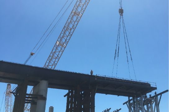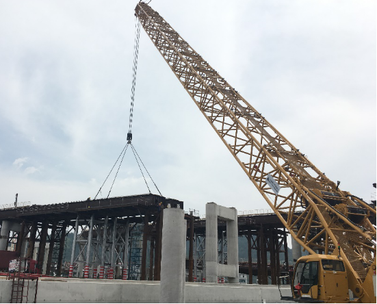 樂(lè)清南塘鋼橋本工程LY匝道、LZ匝道、D匝道、MY匝道部分為鋼結(jié)構(gòu),鋼結(jié)構(gòu)采用的形式是疊合梁結(jié)構(gòu),MY匝道結(jié)合梁橋橋?qū)?2.3m,橋跨布置為40+50m,在甬臺(tái)溫高速中央分隔帶上設(shè)獨(dú)柱墩。主梁中心梁高2.2m,鋼梁高1.8m。全橋處于緩和曲線和圓曲線段上,橋面設(shè)置4.847~5%的橫坡,鋼箱梁按等高制作,頂、底板傾斜形成5%的橫坡,超高段的橫坡差值通過(guò)橋面板梗肋的高度來(lái)調(diào)整,MY匝道結(jié)合梁斷面結(jié)構(gòu)圖如下:單個(gè)開(kāi)口鋼箱梁底寬為3.1m,底板厚度44mm、24mm,底板橫向共設(shè)5道縱向板式加勁;單個(gè)開(kāi)口鋼箱梁設(shè)2道腹板,腹板中心間距3m,腹板厚度為24mm和16mm,腹板內(nèi)設(shè)豎向加勁;鋼箱梁上翼板寬度0.6m,鋼板厚度24mm,翼板頂面設(shè)剪力釘。鋼板內(nèi)設(shè)橫隔板,標(biāo)準(zhǔn)厚度12mm,支點(diǎn)附近加厚至30mm。兩個(gè)開(kāi)口鋼箱梁通過(guò)工字形橫梁連接。